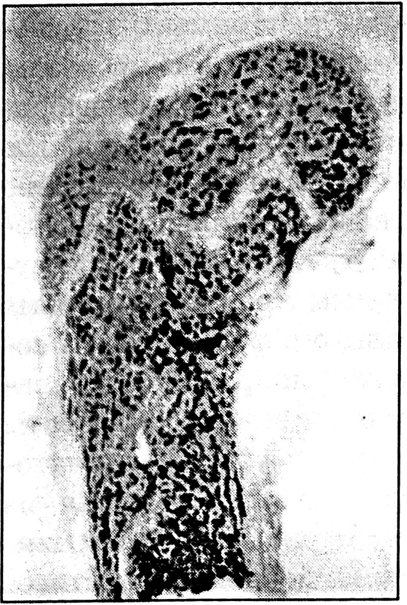 Во II серии (5 щенков) диастаз между отломками в 1-2 мм создавали на 2-3-и сутки после эпифизеолиза, до этого отломки находились в перерастянутом состоянии (до 10 мм) в модифицированном аппарате Илизарова. Срок эксперимента в этой серии составлял 21-28 дней.