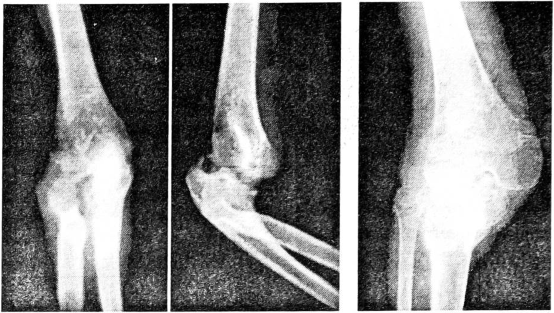 Рис. 2. Развитие у больной с ожоговым истощением остеопороза, подвывихов в локтевом и коленном суставах.
