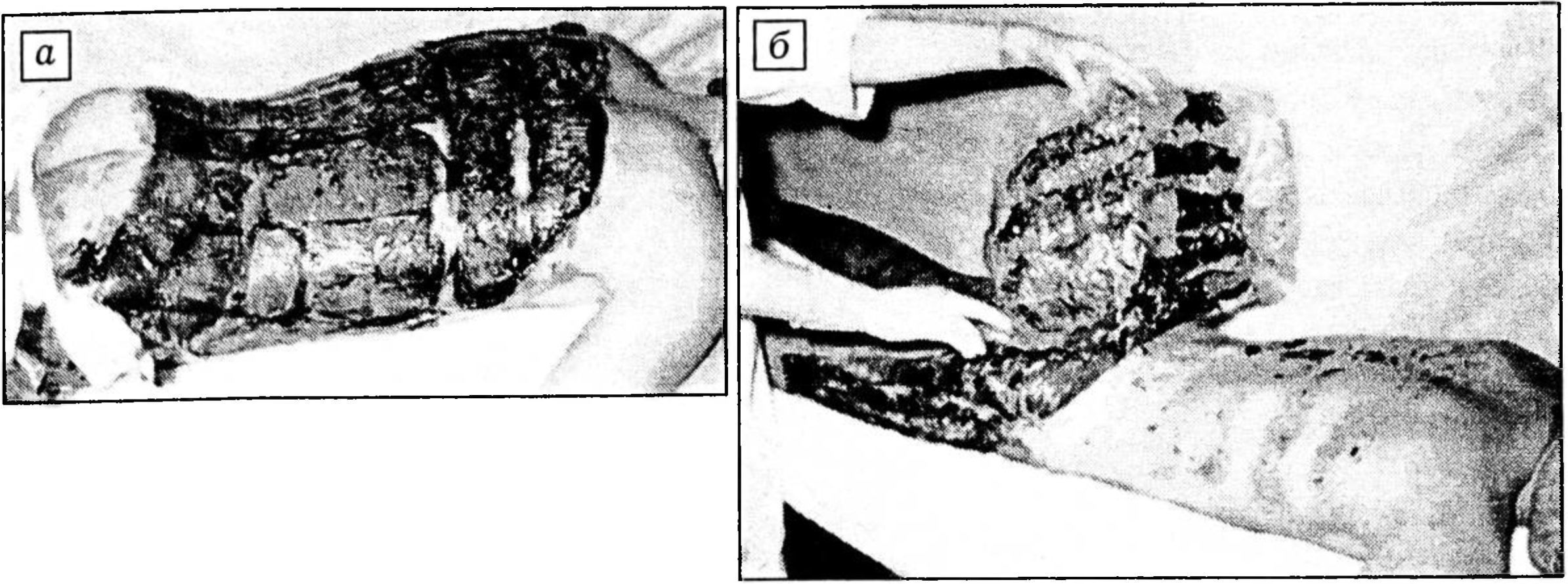 Рис. 3. Лечение ран донорских участков a — раны укрыты перфорированной пленкой из поливинилового спирта; б — удаление пленки по заживлении ран.
