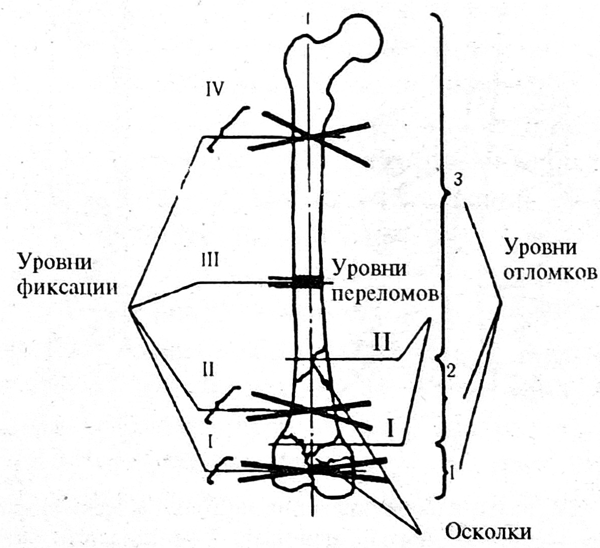 Рис. 1. Уровни перелома (I, II, ...), уровни отломков (1, 2, 3, ...) и уровни фиксации (I, II, III, IV, ...).