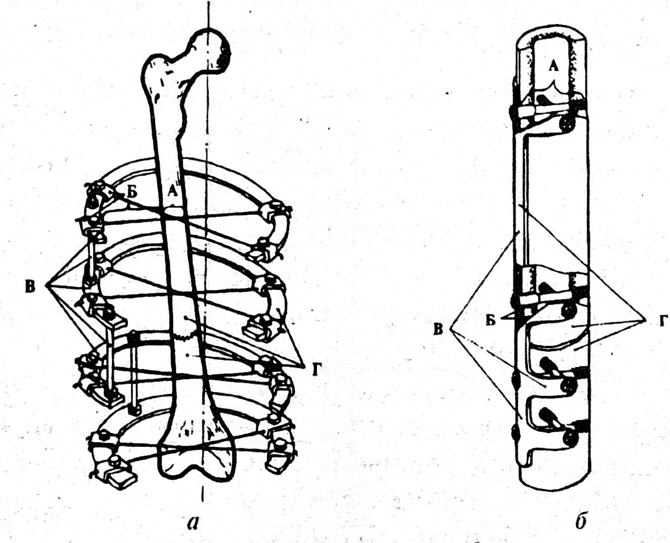 С целью наиболее полного учета и анализа условий, необходимых для создания стабильной фиксации отломков тем или иным методом остеосинтеза (интрамедуллярный, накостный, чрескостный и т.д.), нами [2, 5] выделены следующие основные системы стабилизации отломков (рис. 3): А — фиксатор — кость (пространство, ограниченное местами плотного контакта компактной части кости с частью элемента крепления или фиксатора); Б — промежуточное звено (пространство между костью и несущей частью фиксатора); В — фиксатор — фиксатор (взаимосвязь между отдельными деталями и узлами фиксатора); Г — кость — кость через фиксатор (взаимосвязь между отломками через фиксатор).