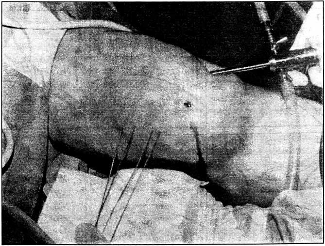 Под контролем артроскопа в положении разгибания коленного сустава чрескожно по медиальному краю надколенника вкалывали (снаружи—внутрь) большую закругленную иглу, острие которой вводили в полость сустава латеральнее места разрыва. Далее иглу «выкалывали» (изнутри—кнаружи) медиальнее места разрыва. При этом нити располагались в полости сустава над зоной разрыва. Через место первого прокола кожи иглу вновь вводили подкожно и выводили через место ее последнего «выкола» (рис. 2).