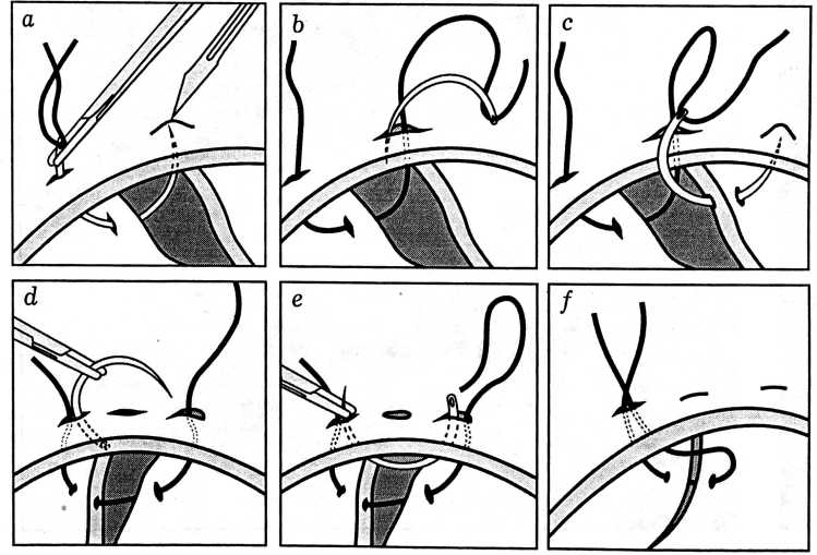 В случаях, когда величина разрыва не позволяла произвести наложение швов по описанной выше методике, делали промежуточный «вкол—выкол» иглы через зону разрыва (рис. 3).