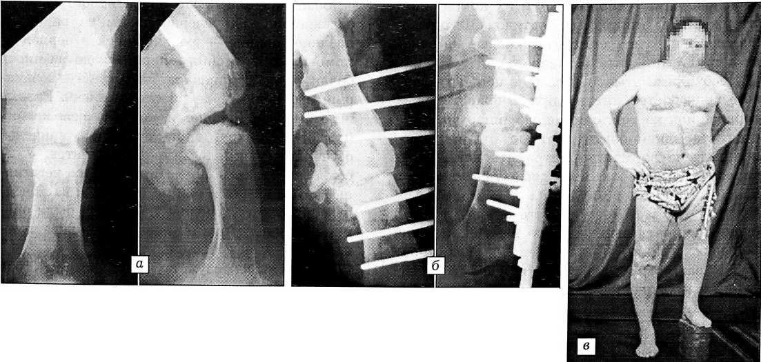 Рис. 1. Больной Ш. Рентгенограммы левого бедра при поступлении (а) и после секвестрнекрэктомии и остеосинеза в стержневом аппарате (б); внешний вид после секвестрнекрэктомии и остеосинтеза (в): укорочение левой нижней конечности на 16 см.