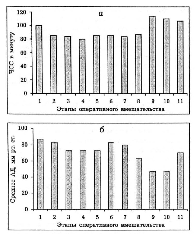 Показатели сердечной деятельности определяли в следующие моменты: 1 — исходный уровень (после премедикации на операционном столе), 2 — после вводного наркоза и интубации, 3 — после поворота на бок, 4 — разрез, 5 — вскрытие плевры, 6 — дискэктомия, 7 — второй разрез при дорсальном доступе, 8 — скелетирование, 9 — дистракция, 10 — ушивание операционной раны, 11 — поворот на спину (см. рис. 1).