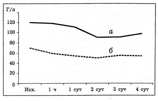 По окончании операции больных в состоянии наркоза при ручной ИВЛ мешком Амбу переводили в отделение реанимации, где продолжали ИВЛ в течение 8-12 ч и осуществляли дальнейшую коррекцию волемических сдвигов и качественного состава крови. На 3- 4-е сутки после операции у больных стабилизировались показатели гемоглобина и уровень белка в крови (рис. 2).