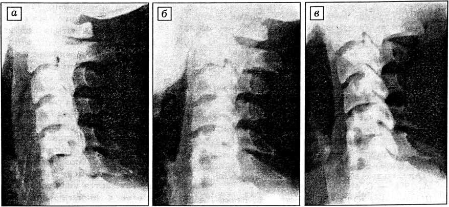 Рентгенограммы шейного отдела позвоночника больного Б. после резекции тела С6 позвонка и спондилодеза по предложенной методике: а — через 7 дней после операции; б — через 6 нед; в — через 9 нед.