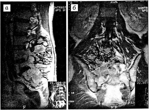 В начале 1993 г. появились боли в пояснице, иррадиирующие в правую ногу, затем припухлость. В феврале 1994 г. в одной из крупных московских больниц удалена «фиброзная гистиоцитома» мягких тканей поясничной области. Через 3 мес после операции стал отмечать слабость в правой ноге, а в 1996 г. обнаружил рост объемного образования в области послеоперационного рубца. Лечился по совету «целителей» мочой (локально и внутрь) без эффекта. Обратился к врачу только в июне 1998 г. В той же больнице проведена магнитно-резонансная томография в режимах СПИН- и МУЛЬТИ-эхо в сагиттальной и аксиальной проекциях; толщина срезов 4 и 5 мм (рис. 1).