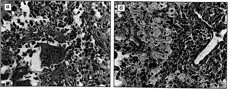 Рис. 2. Микрофотограммы очага поражения мягких тканей поясничной области больного Б. Пигментный виллезонодулярный синовит позвоночника. а - характерные щелевидные пространства, выстланные клетками, напоминающими синовиоциты. В одном из просветов многоядерная гигантская клетка; б — скопление ксантомных клеток и зерна гемосидерина в непосредственной близости от щелевидного пространства. Окраска гематоксилином и эозином. Ув. 200.