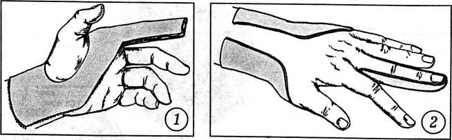 Иммобилизацию производили различными способами — в зависимости от вида повреждения. Чаще всего использовали деревянную шину-шпатель, обернутую 6—8 слоями бинта. Применяли также желобоватую гипсовую лонгету (рис. 1). В ряде случаев использовали лонгету-«лодочку», которая охватывает ладонную, боковые поверхности и кончик пальца, оставляя свободной зону ногтевого ложа и тыльную поверхность пальца, и доходит до нижней трети предплечья (рис. 2). Такая повязка, применяемая преимущественно при открытых переломах, не только создает надежную иммобилизацию, препятствуя вторичному смещению отломков, но и позволяет безболезненно делать перевязки, не снимая гипсовую лонгету.