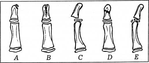 Анализ клинического материала позволяет выделить 5 основных типов переломов ногтевых фаланг.