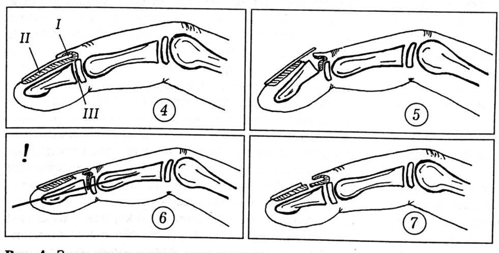 При открытом эпифизеолизе ногтевой фаланги пальца (рис. 4) происходит смещение ее дистального отломка в сторону тыльной поверхности. Повреждение проходит в зонах наименьшего сопротивления: ногтевая пластинка вывихивается у основания (см. рис. 4, I), ногтевое ложе повреждается дистальнее — в проксимальной его трети (II), а кость смещается по линии ростковой зоны, т.е. проксимальнее повреждений ногтевой пластинки и ногтевого ложа (Ш). При этом ногтевая матрица, как правило, располагается между отломками кости (рис. 5).
