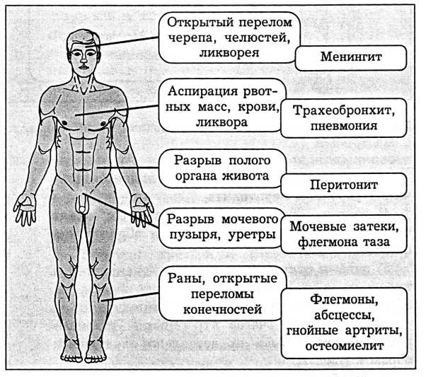 Кроме того, большое значение имеют множественность очагов первичного, вторичного и ятрогенного инфицирования, снижение иммунитета, внедрение инфекционного агента на фоне некоторых специфических осложнений политравмы (респираторный дистресс-синдром, ранняя полиорганная недостаточность, синдром диссеминированного внутрисосудистого свертывания — ДВС и др.).