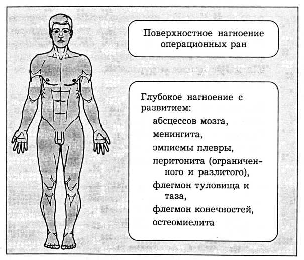 Осложнения, обусловленные собственно хирургическими причинами (несостоятельность швов желудочно-кишечного тракта с развитием перитонита, нагноение открытых переломов с развитием флегмон, анаэробная инфекция и т.п.), занимают в структуре инфекционных осложнений небольшое место — 6,8%.