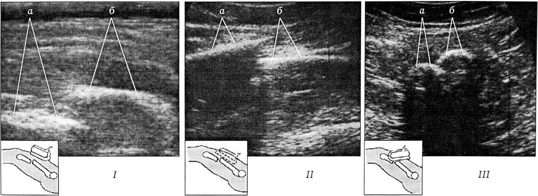 Сагиттальное сканирование соответствовало рентгенографии в боковой, а фронтальное — в прямой (переднезадней) проекции. Сканирование в горизонтальной проекции (перпендикулярно оси диафиза кости) позволяло получить дополнительную информацию о взаимоотношении костных отломков. Верификация результатов эхографических исследований проводилась нами на основе сопоставления с данными рентгенографии. Эхографический контроль у большинства больных использовался также на этапе закрытой репозиции при выполнении интрамедуллярного остеосинтеза.