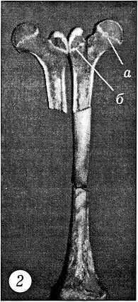 Рис. 2. Фронтальный распил проксимального отдела бедренной кости. а — эпифизарная, б — апофизарная зона роста.