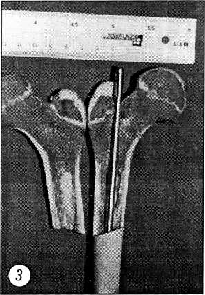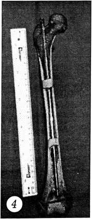 Исследование распилов препаратов бедренной кости на всем протяжении после моделирования закрытого интрамедуллярного остеосинтеза стержнем Богданова позволило убедиться в достаточной стабильности конструкции, в том числе и ротационной. Это обусловливалось жесткой посадкой стержня, прежде всего в проксимальном отделе бедренной кости и ее дистальном метафизе, а также наличием опоры в узкой части костномозгового канала.