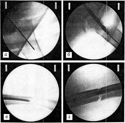 Рис. 5. Этапы закрытого интрамедуллярного остеосинтеза. а — введена направляющая спица; б — сформирован канал в метафизарной зоне проксимального отломка; в — введен стержень до уровня перелома; г — стержень проведен в дистальный отломок.