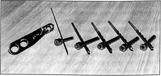 С целью снижения травматичности и сокращения длительности оперативного вмешательства нами разработан комплект хирургических инструментов для выполнения закрытого антеградного интрамедуллярного остеосинтеза. Этот комплект, включающий защитник-направитель, канюлированное сверло и направляющую спицу, был апробирован в эксперименте при моделировании остеосинтеза на изолированных препаратах бедренной кости, а впоследствии успешно использован в клинической практике (рис. 6).