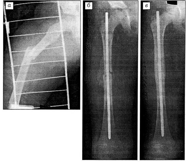 Рис. 7. Рентгенограммы бедренной кости ребенка 6 лет (прямая проекция). а — до операции, б — после операции, в — через 6 мес.