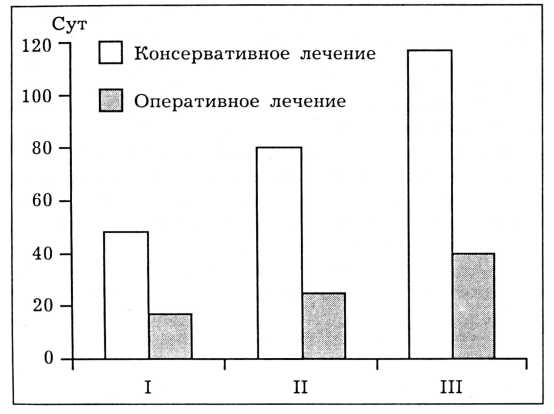 Рис. 8. Сроки вертикализации больных (I), частичной (II) и полной (III) нагрузки на поврежденную конечность при оперативном (собственные наблюдения) и консервативном (данные литературы) лечении.
