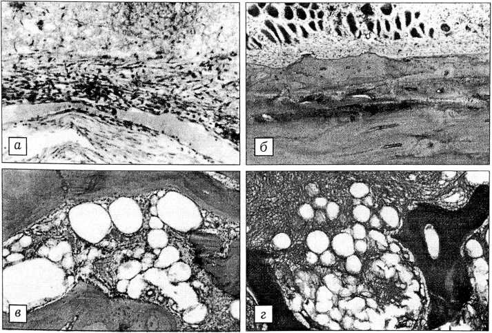 Рис. 1. 5-й день эксперимента. Собака № 5141. а — пролиферация клеток наружного слоя твердой мозговой оболочки и врастание их в гематому между краем дефекта и костным фрагментом (окраска гематоксилином и эозином. Об. 16, ок. 10); б — пролиферация клеток внутреннего слоя надкостницы на дорсальной поверхности фрагмента (окраска гематоксилином и эозином. Об. 16, ок. 10); в — пролиферация скелетогенной ткани в теменной кости у края дефекта (окраска гематоксилином и эозином. Об. 6,3, ок. 10); г — сеть аргирофильных волокон в зоне эндостальной реакции вблизи от края перемещаемого фрагмента (импрегнированный препарат. Об. 6,3, ок. 10).