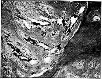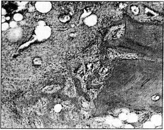 Рис. 3. 10-й день эксперимента. Собака № 0518. Грубоволокнистая костная ткань, растущая со стороны края дефекта (окраска гематоксилином и эозином. Об. 6,3, ок. 10).