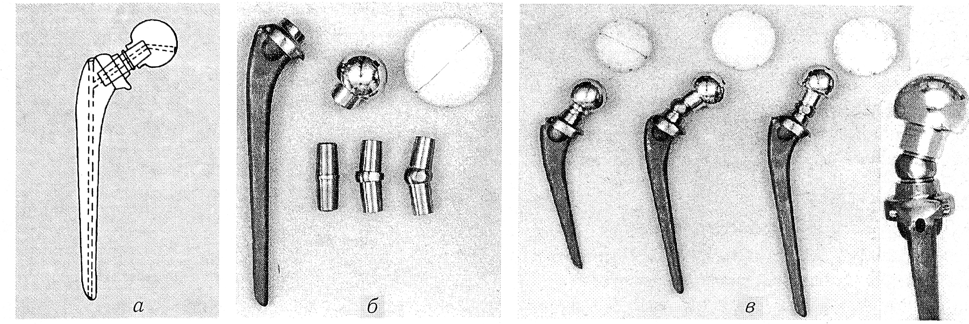 а — схема; б — эндопротез в разобранном виде со сменными шейками; в — эндопротез в сборе: слева направо — нормальный шеечно-диафизарный угол, варус, вальгус, антеверсия (вид сверху).