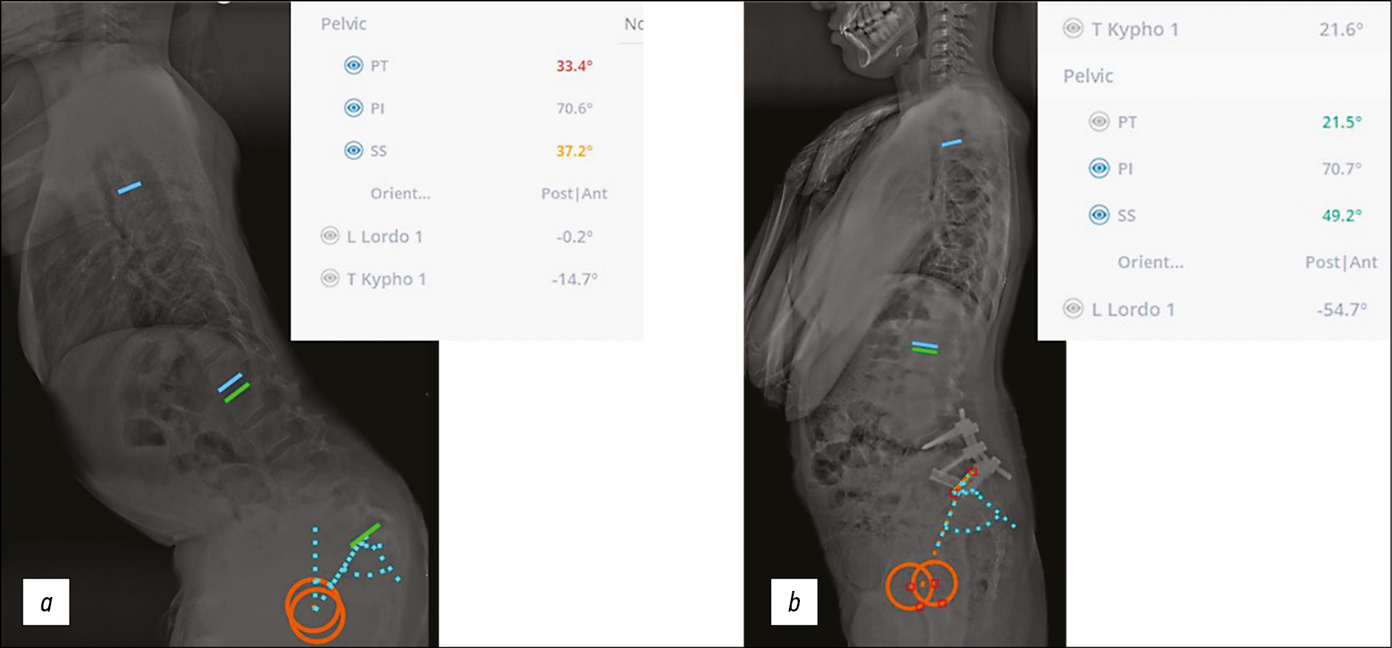 Рис. 2. Параметры сагиттального баланса у пациентки 13 лет со спондилолистезом L5, SDSG 6 тип до (а) и после (b) оперативного лечения, а также расчет теоретических параметров поясничного лордоза (LL) и грудного кифоза (TK) на этапе предоперационного планирования. Расчетные параметры: 1) LL=PI×0,54+28, LL=66,1; 2) TK=0,75×LL, TK=49,5.