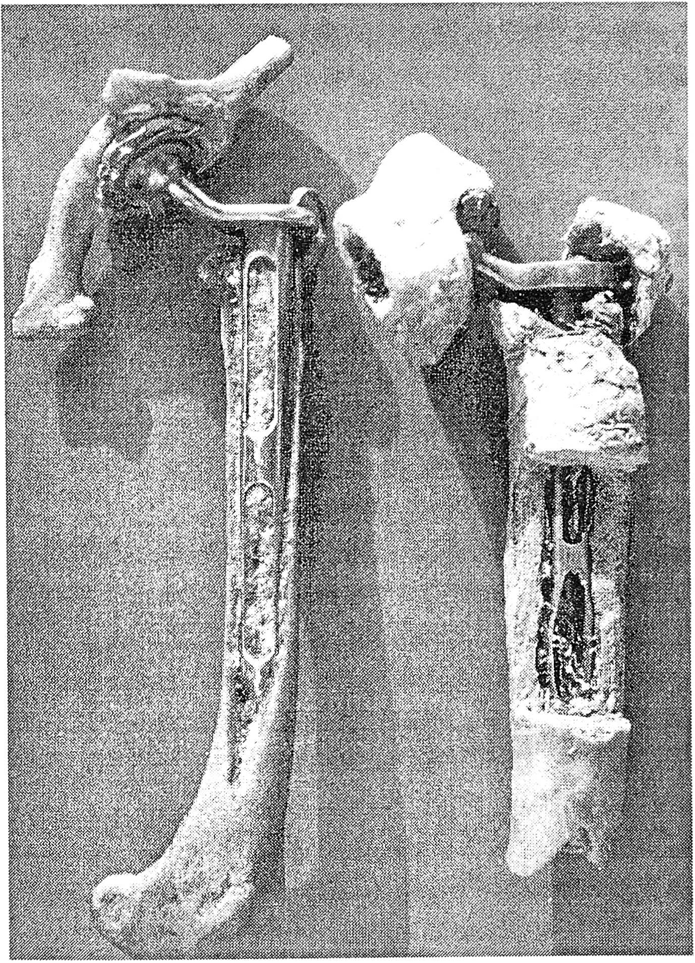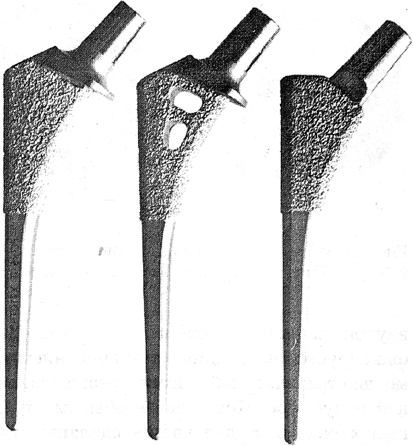 Первый этап — выбор концепции и исследование нового пористого покрытия для эндопротезов. Экспериментами К.М. Сиваша установлено, что кость врастает в окна и пазы металлического стержня ножки и чашки (рис. 1). Доказано влияние костного врастания на стабильность крепления компонентов в костном ложе наряду со значением первично-прочного механического задела на границе металл— кость. Однако некоторые недостатки конструкции (гладкий конусный стержень и биомеханически неблагоприятное расположение в нем окон) способствовали развитию ротационной (пусковой), а затем и других направлений нестабильности, усталостному перелому стержня. Недостаточная площадь окон для врастания кости относительно площади всего стержня в сочетании с вышеуказанными особенностями конструкции были, по-видимому, тем минимумом дестабилизирующих факторов, который обусловливал разлом или расшатывание эндопротеза. Немаловажную роль в механизме расшатывания играл и металло-металлический узел подвижности с высокой степенью трения.
