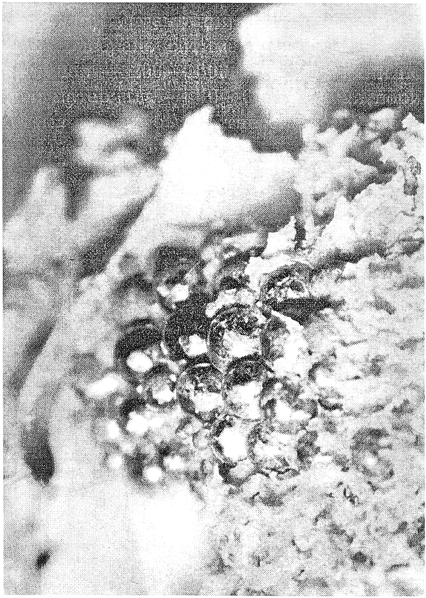 Согласно плану эксперимента, нами подбирались шарики различного диаметра и фракционного состава (соотношение количества шариков разного диаметра в одной группе). Из них методом спекания изготавливались экспериментальные образцы в форме пробки диаметром 4,5 мм и длиной 6 мм, которые имплантировались в приготовленное ложе в диафизарном и метадиафизарном отделе бедренной кости собаки. Изучались сроки врастания кости и степень ее зрелости, прочность биологической фиксации образцов в костной ткани. Тестом на выталкивание (сопротивление на срез), проводимым на испытательной машине «Zwick» (Германия), измеряли прочность фиксации образцов в кости в зависимости от сроков после имплантации (от 3 нед до 12 мес). Было подобрано оптимальное сочетание размеров пор — 200—1500 мкм и степени пористости материала — 40—60 %. Такая, пористая система может быть отнесена к макропористой. Исследовали 3 группы образцов: 1-я — шарики диаметром 0,1—0,3 мм, 2-я — 0,3— 0,7 мм, 3-я — 0,7—1,0 мм. Констатировано врастание кости на всю толщину первого слоя шариков и глубже (рис. 2) и по всему периметру цилиндрического образца из спеченных шариков (рис. 3). Измеряли общую площадь контакта с костью по периметру образца; врастание кости (в процентах к поровому пространству образца); образование кости (в процентах к площади поверхности цилиндрического образца); костный индекс (количественное соотношение врастания и образования кости); глубину проникновения кости в образец. Всего изучено 85 имплантированных образцов, которые устанавливались по 3—4 на одной или обеих бедренных костях собак.