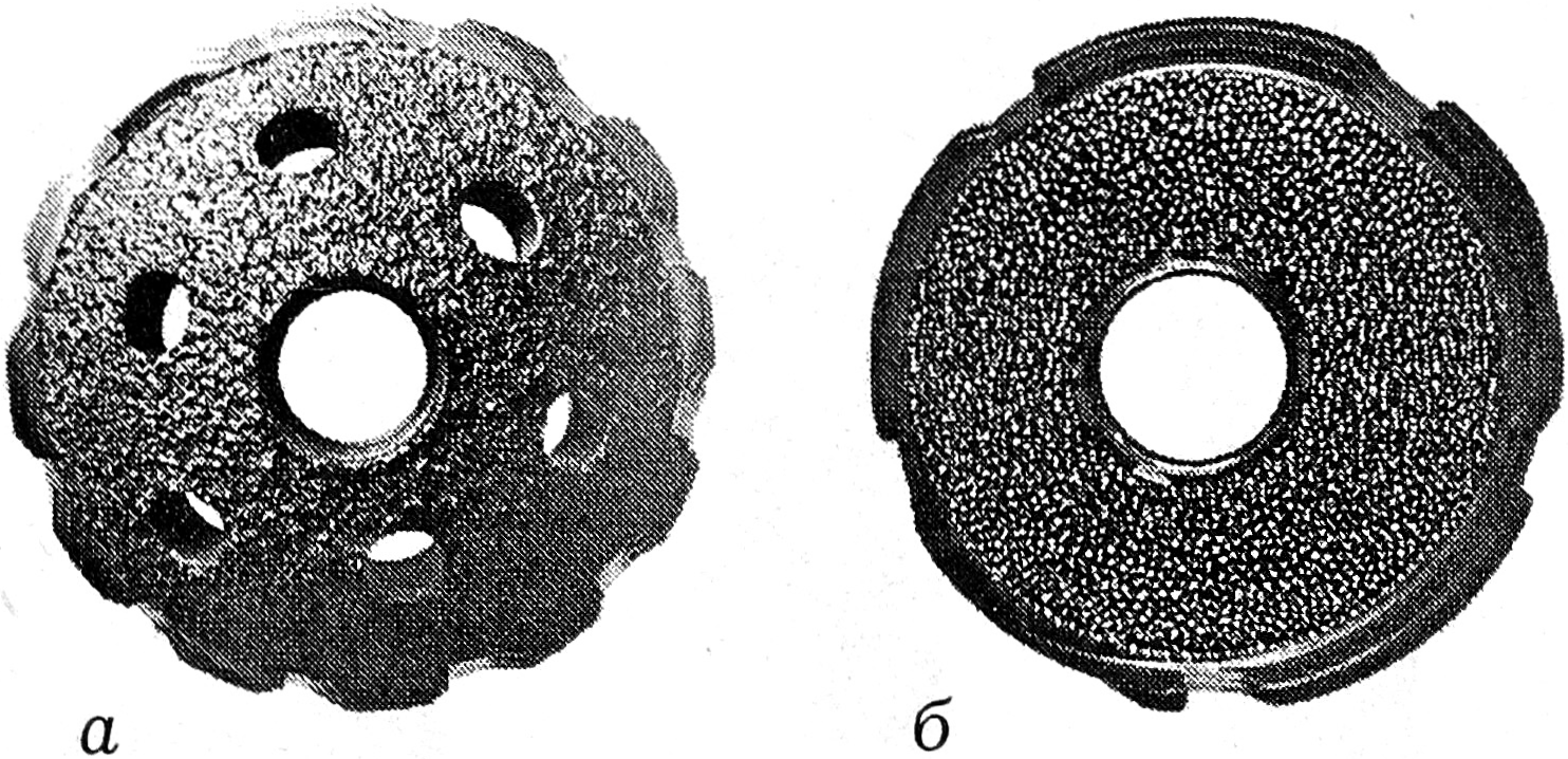 Рис. 5. Протезы вертлужной впадины с мелкопористым покрытием (а) и покрытием из шариков (б).