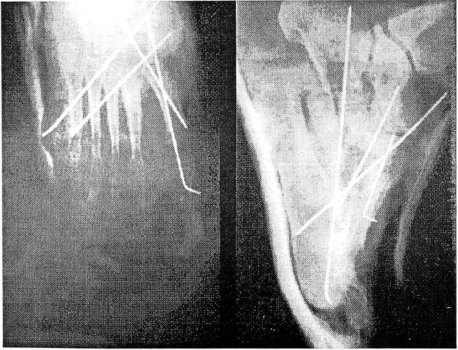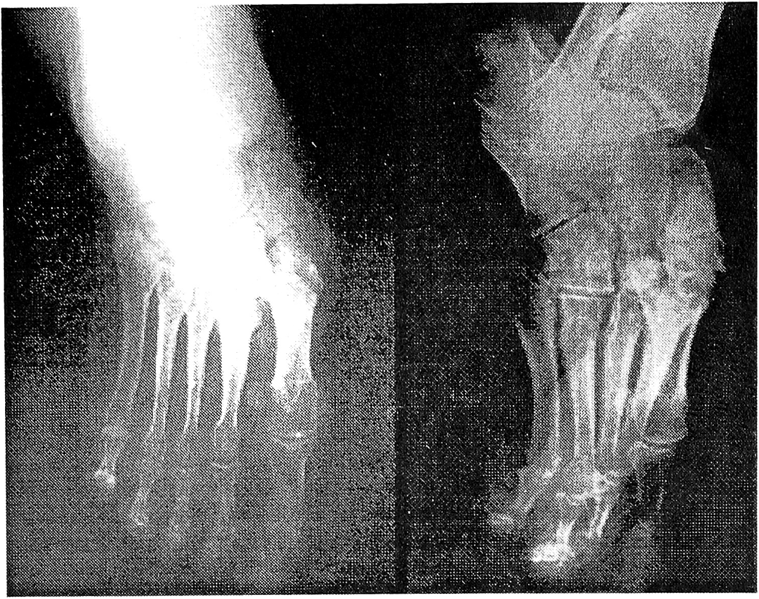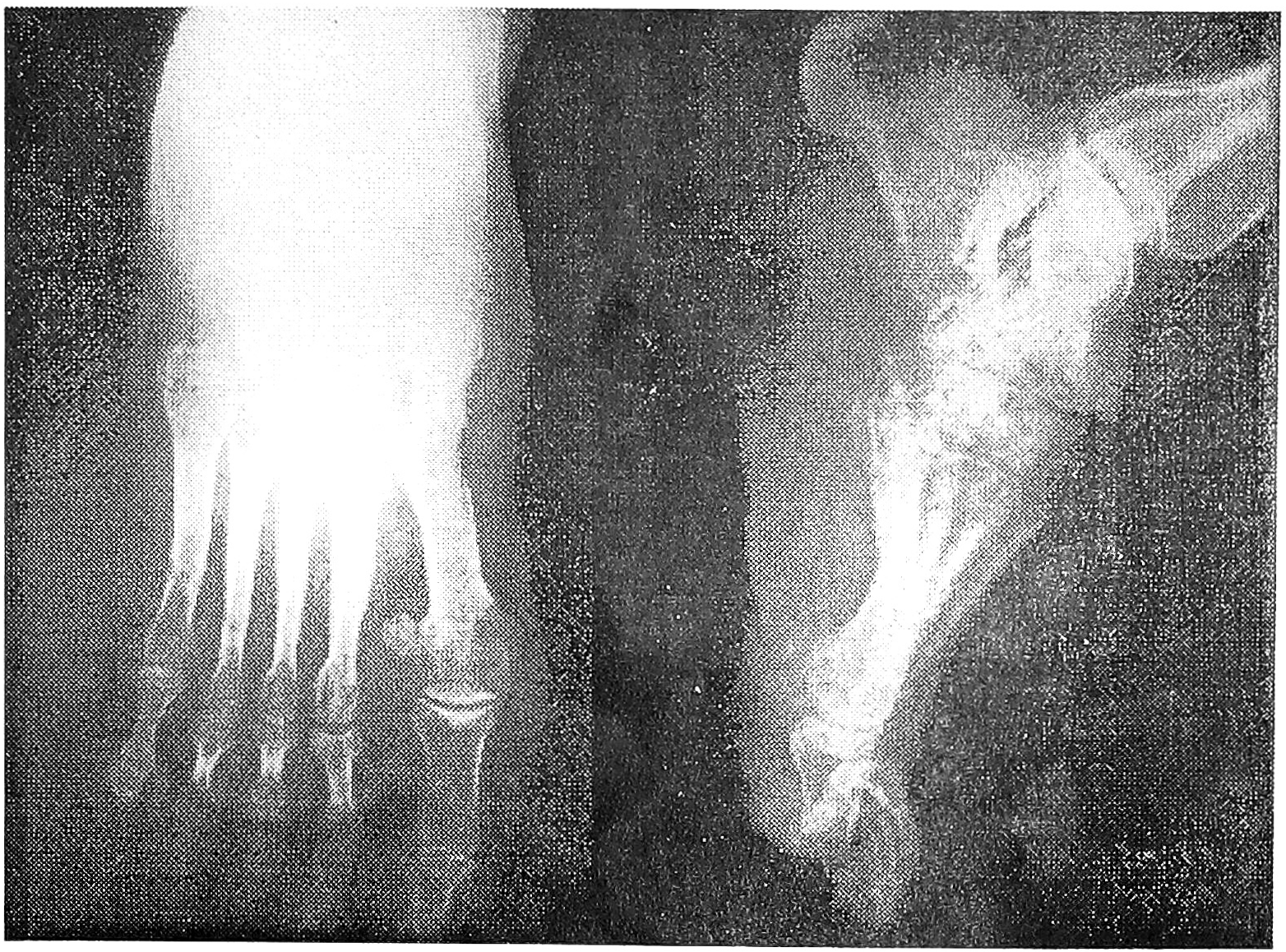 Рис. 1. Рентгенограммы больной П. до операции в прямой и боковой проекции. Виден застарелый дивергирующий переломовывих в суставе Лисфранка.