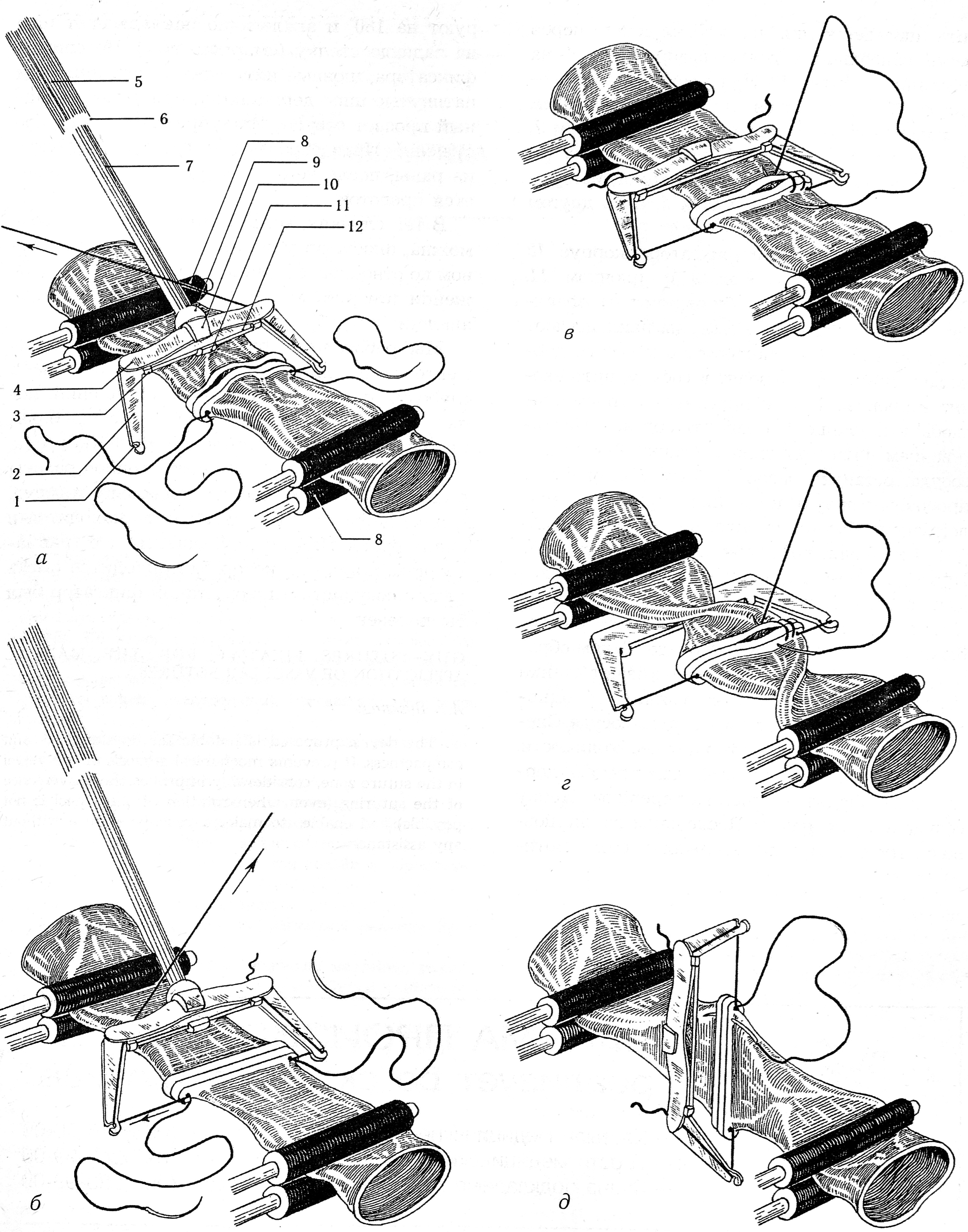 а — момент установки фиксатора: на концы сосуда наложены швы-держалки, одна из нитей заведена через прорезь 1 под пружину 4, б — вторая нить шва-держалки заведена через прорезь 1 под пружину 4, ширина просвета сосуда зафиксирована; в — накладывается обвивной шов на переднюю стенку сосуда; г — произведена ротация сосуда на 180° между зажимами, накладывается обвивной шов на заднюю стенку сосуда; д — вариант наложения сосудистого шва при невозможности ротации сосуда: фиксатор швов-держалок устанавливается вертикально.