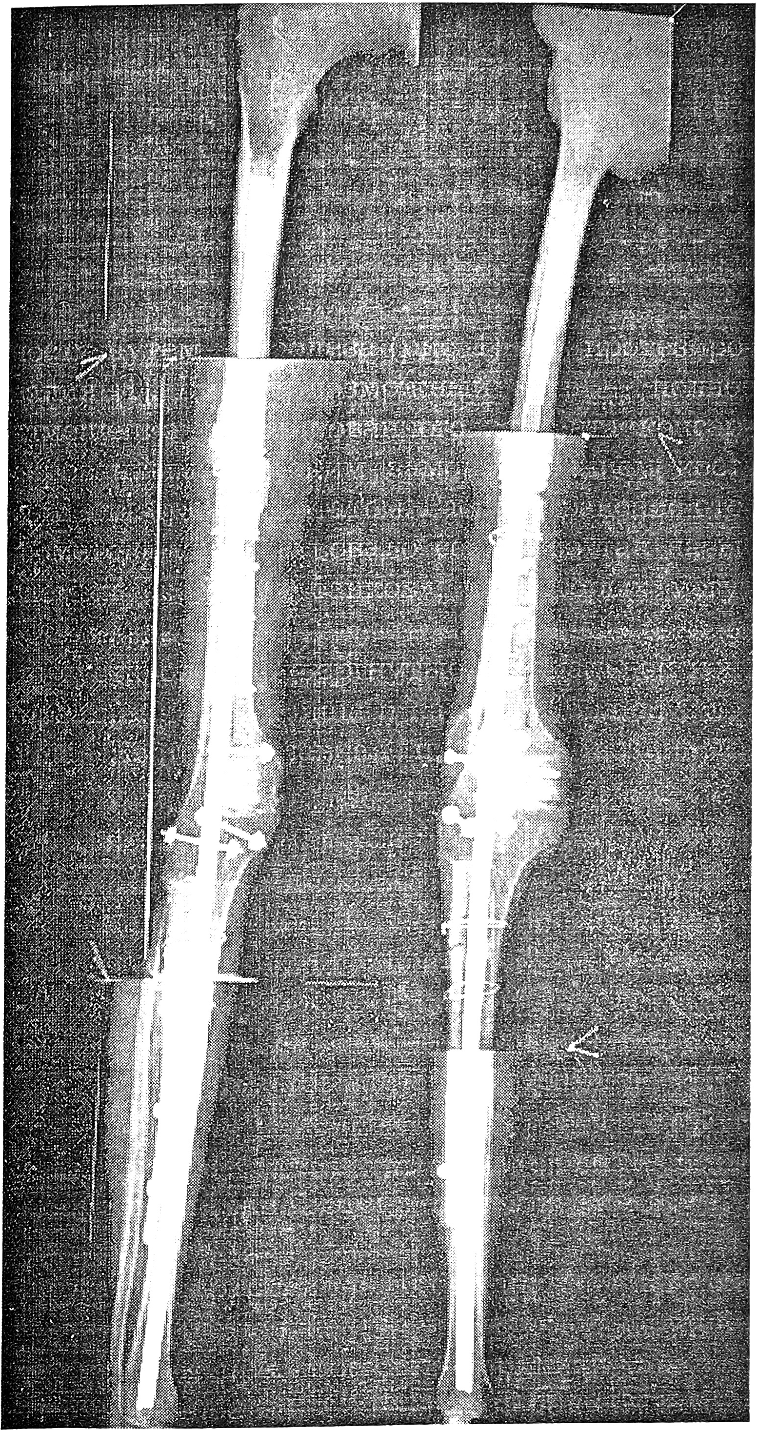 Рис. 1. Рентгенограмма больного 21 года с остеосаркомой дистального метафиза бедренной кости через полгода после обширной резекции и артродеза по Путти с применением интрамедуллярной фиксации гвоздем. Дефект медиальной части бедренной и латеральной части большеберцовой кости замещен аллотрансплантатом.