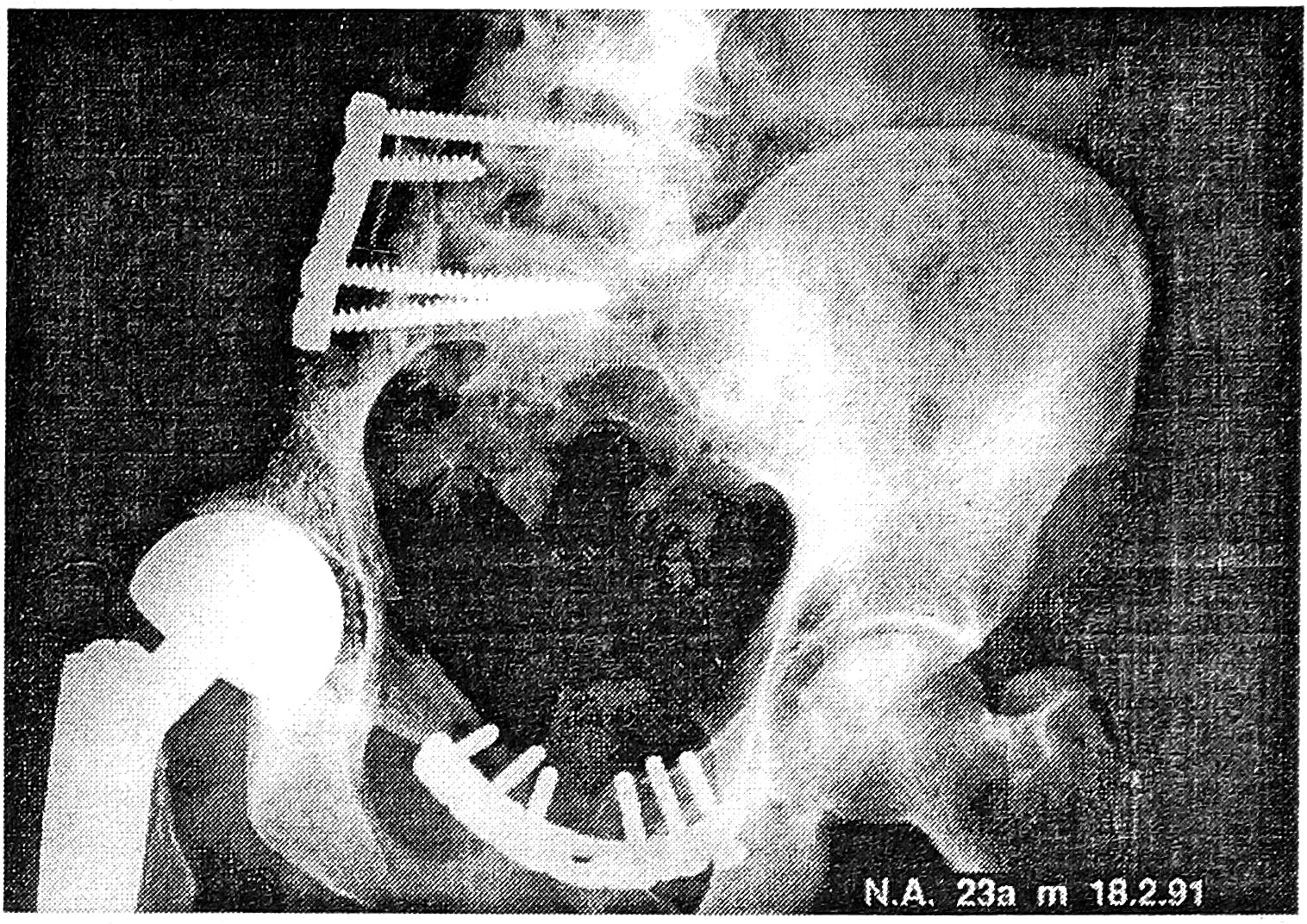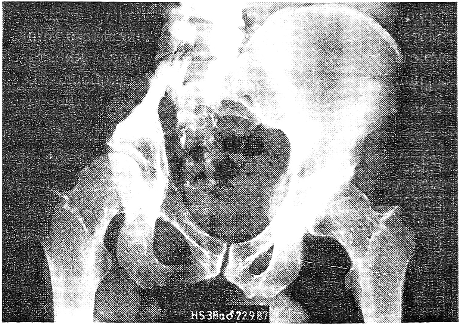 Рис. 3. Рентгенограмма больного 36 лет через 5 лет после резекции лонной кости и боковой массы таза справа по поводу остеосаркомы с замещением дефекта трансплантатом из большеберцовой кости.