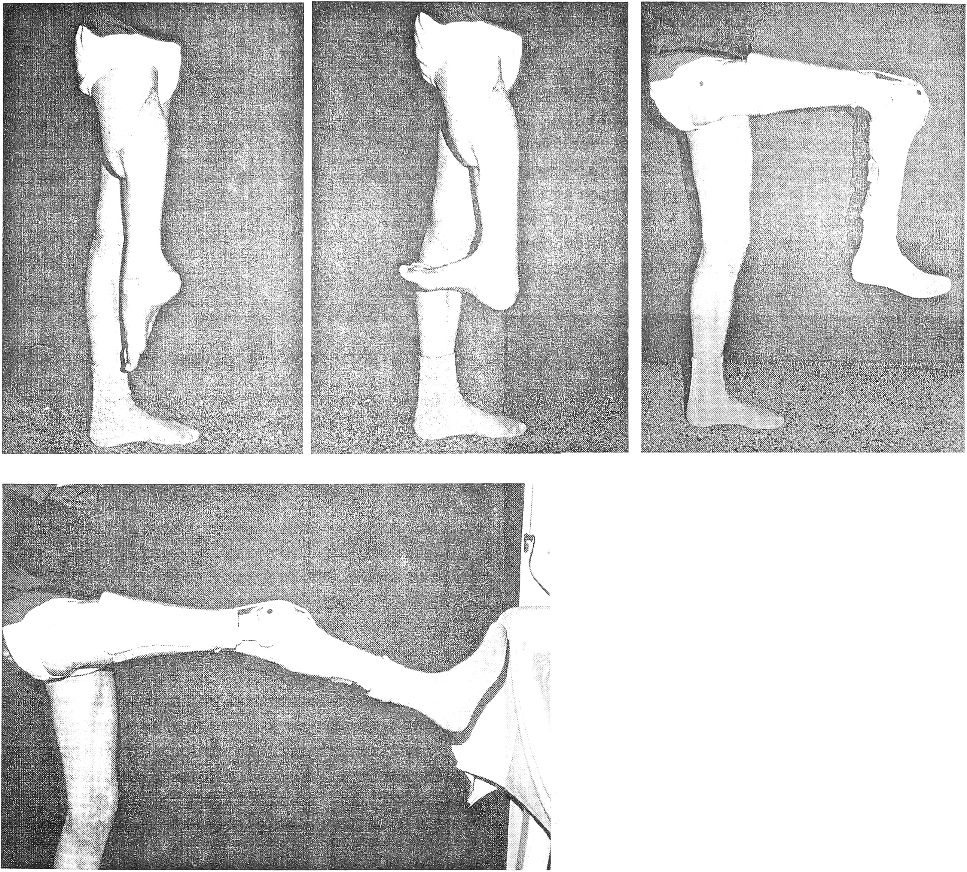 Рис. 4. Больной 20 лет через 5 лет после ротационной пластики по поводу остеосаркомы дистального конца правой бедренной кости: вид сбоку без протеза и функция правой ноги с протезом.