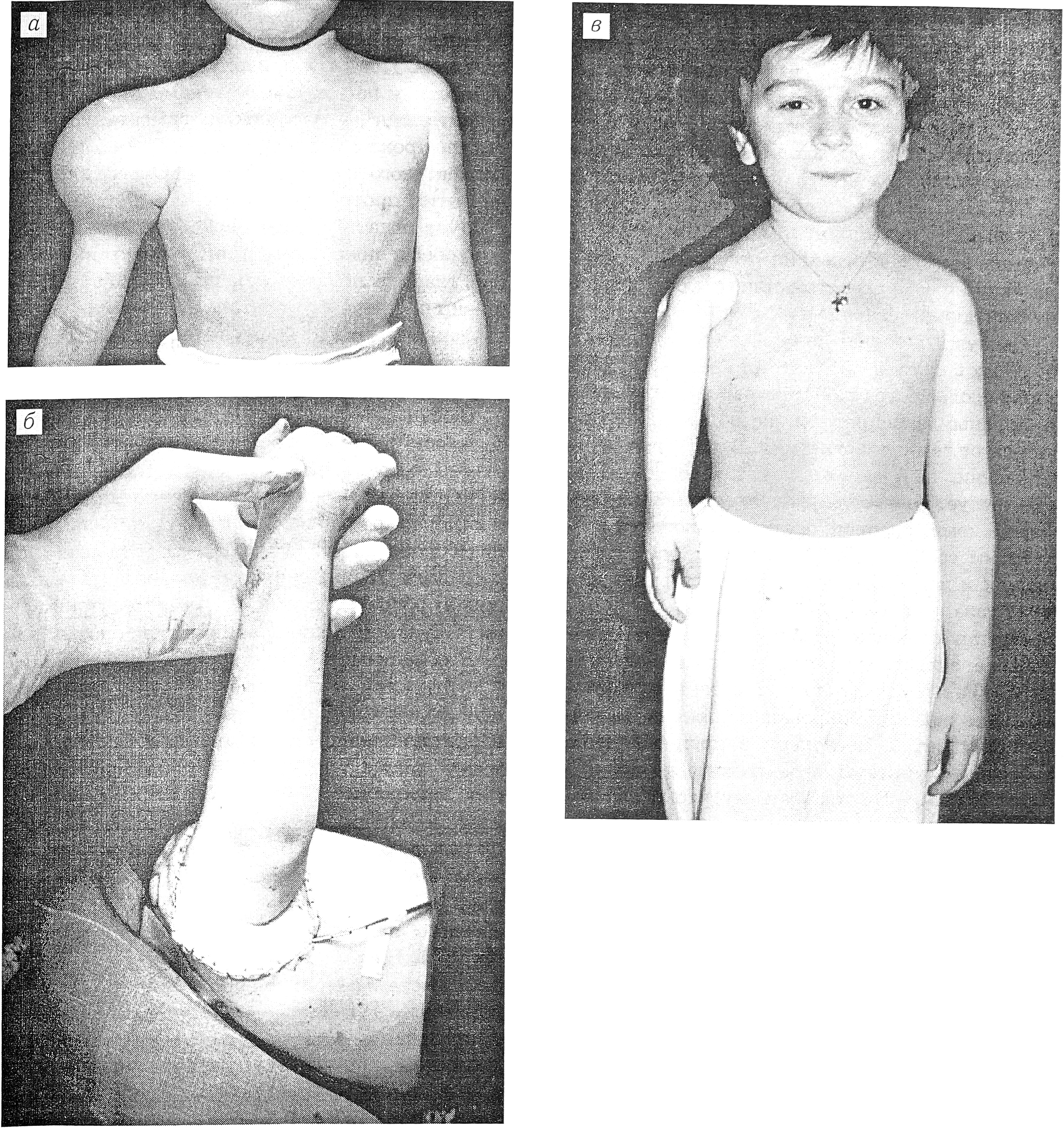а — до операции; б — реимплантация предплечья на грудную клетку; в — через 1,5 года после операции: функционирующие правое предплечье и правая кисть.