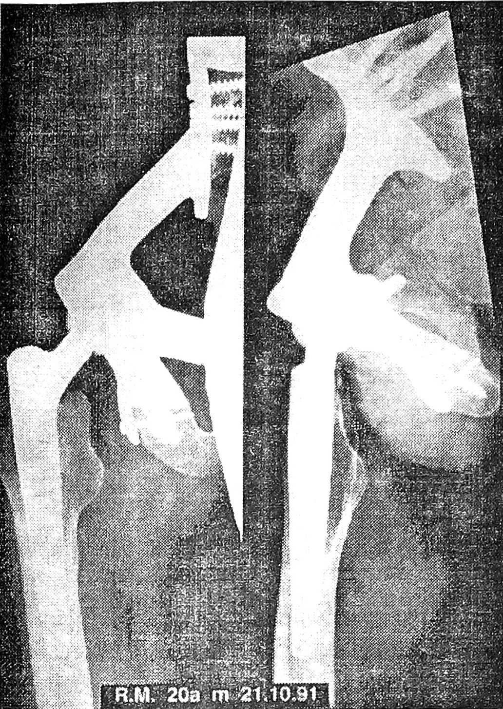 Попытки избежать ампутации конечностей при обнаружении злокачественной опухоли кости или мягких тканей предпринимались хирургами уже в начале нашего столетия. Одна из них была связана с пластикой по F. Sauerbruch: после резекции бедренной кости голень перемещали вверх и укладывали в кожно-мышечное ложе, в результате чего образовывалась культя, пригодная для протезирования. П.И. Тихов и В. Linberg производили обширную резекцию лопатки и проксимального конца плечевой кости, сохраняя «удлиненную» и нестабильную, но зато подвижную верхнюю конечность [5]. Сохранение стабильности нижней конечности за счет имплантации опухолевых протезов представлялось наиболее целесообразным. Первая операция такого типа выполнена в конце 30-х годов А. Moore при гигантоклеточной опухоли проксимального отдела бедренной кости. В конце 50-х — начале 60-х годов, с развитием эндопротезирования бедра, усилилась и тенденция к разработке и имплантации специальных протезов для пациентов с опухолевыми заболеваниями [7].