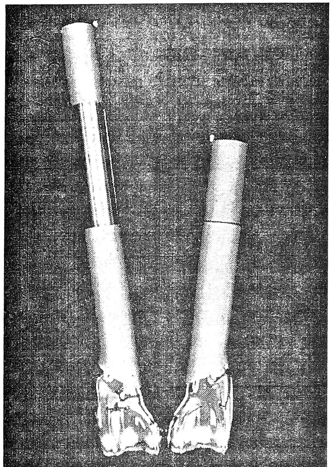 Методам резекции-реконструкции может быть противопоставлена резекция-реимплантация [4], которая позволяет сохранять конечность даже при удалении очень крупных опухолей, циркулярно поражающих весь сегмент. При операциях на нижней конечности используется так называемая поворотная пластика [6], при которой производится резекция цилиндрического сегмента конечности, в большинстве случаев с сохранением только нервов, а затем реимплантация дистального сегмента с реконструкцией сосудов. Поскольку обращенная вперед ступня и укороченная бедренная кость неудобны для протезирования, может быть рекомендован метод J. Borggreve — поворот голени назад на 180°, в результате чего становится возможным протезирование и создание сравнительно активного подвижного «коленного» сустава (рис. 4). Благодаря сохранению ноги у пациента не возникает ощущения ампутации, а кроме того, функциональность конечности существенно выше, чем при ампутации и протезировании бедренной кости.