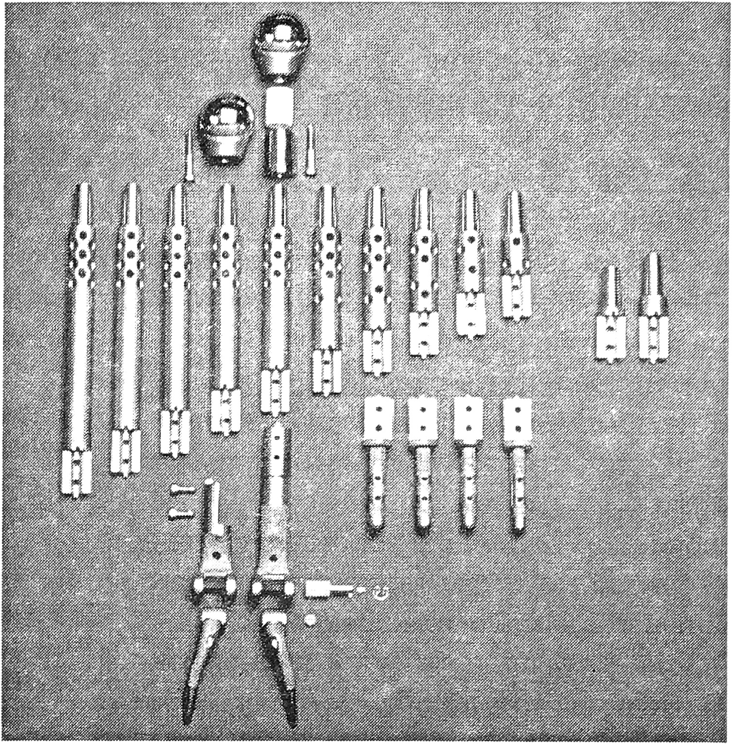 В ортопедической клинике Венского университета имеется опыт имплантации опухолевых протезов как верхних, так и нижних конечностей. С 1974 г. используются модульные протезы верхней конечности, которые сначала изготавливались из керамики, а затем из металла. Первоначально удавалось заменять только проксимальный конец плечевой кости. Однако для того, чтобы удовлетворить индивидуальные запросы пациентов, в этих случаях было необходимо работать со всей плечевой костью, заменяя локтевой сустав или дистальный конец плечевой кости с локтевым суставом. Поэтому при опухолях верхней конечности у нас используется модульный блок из виталлия, позволяющий замещать дефекты от проксимального конца плечевой кости до локтевого сустава (рис. 8). Опыт применения этих протезов показал, что предпочтение следует отдать методу бесцементного крепления, обеспечивающему прямое врастание костной ткани в поверхность протеза. Улучшение функции плечевого сустава возможно за счет создания в головке протеза отверстий для фиксации мышц с помощью полосок широкой фасции.