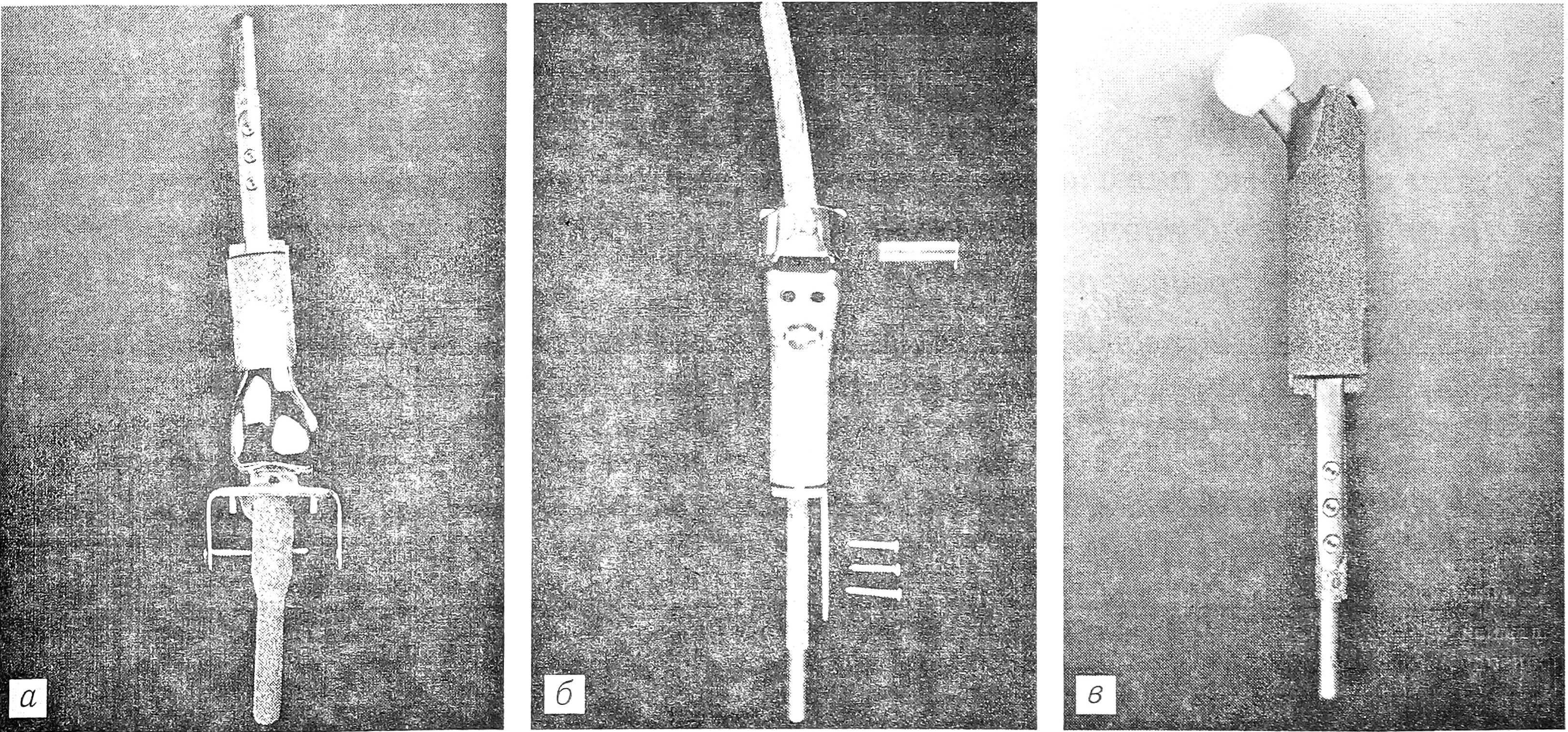 а — для замещения дистальной части бедренной кости, б — проксимальной части большеберцовой кости, в — проксимальной части бедренной кости.