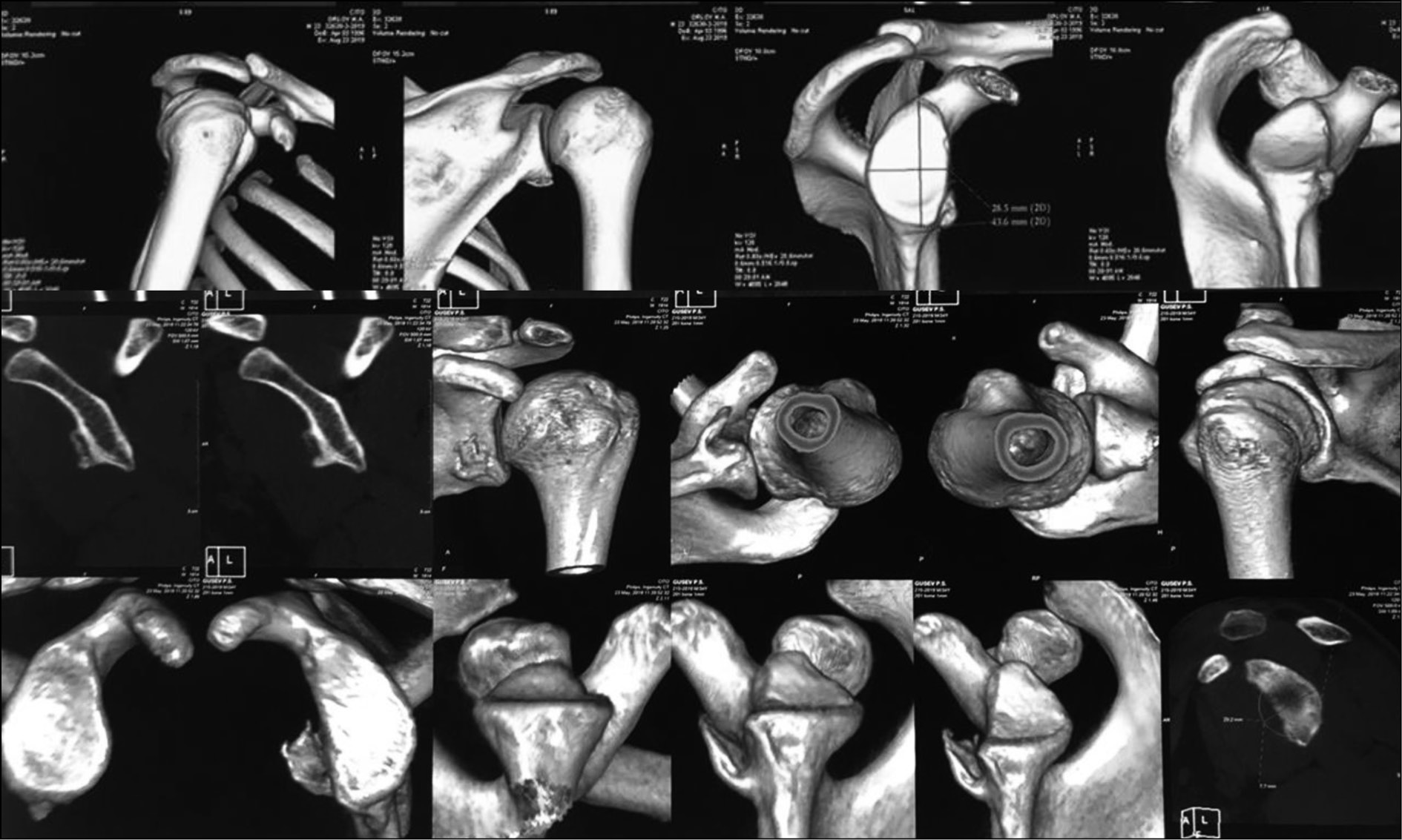 When implementing the diagnostic technique, they considered defects in the articular surface of the scapula, options for its compensation, and the shape of the coracoid process. This was done to determine the level of osteotomy and fixation in the anterior–inferior part of the scapular cavity (Fig. 1) [21, 24].