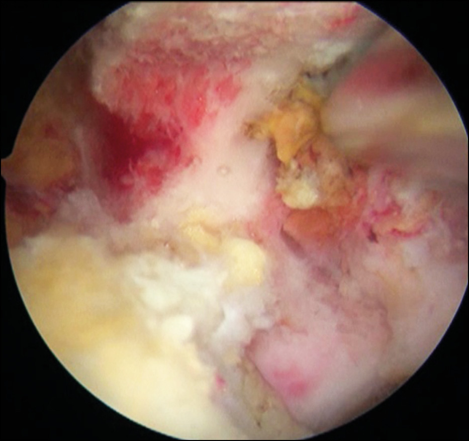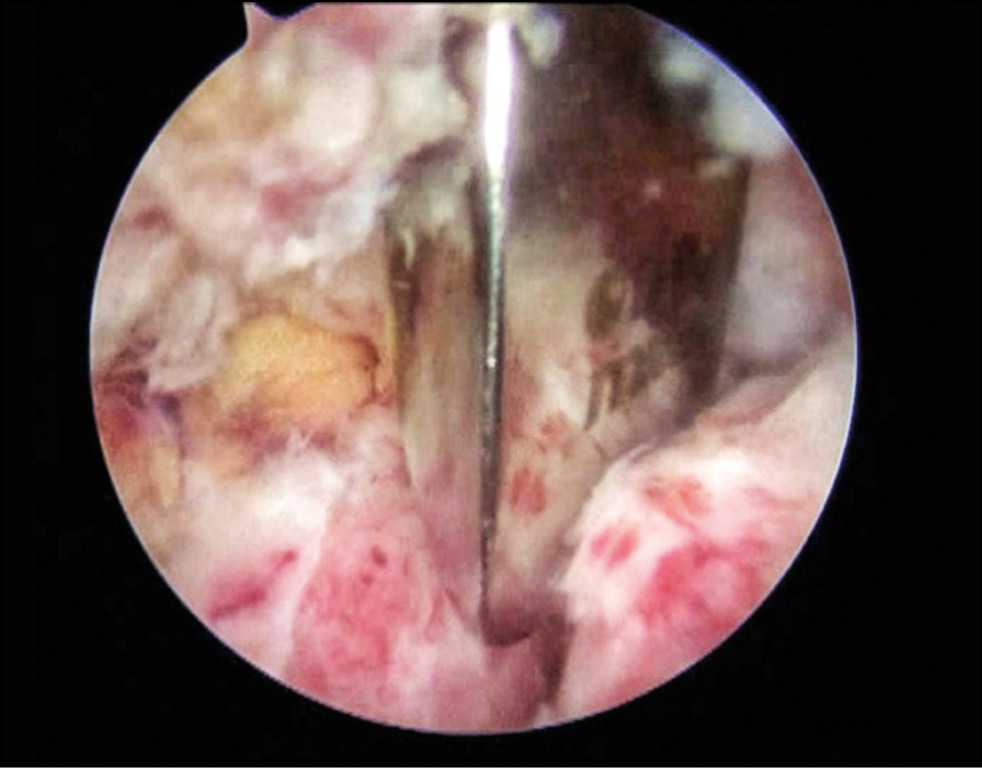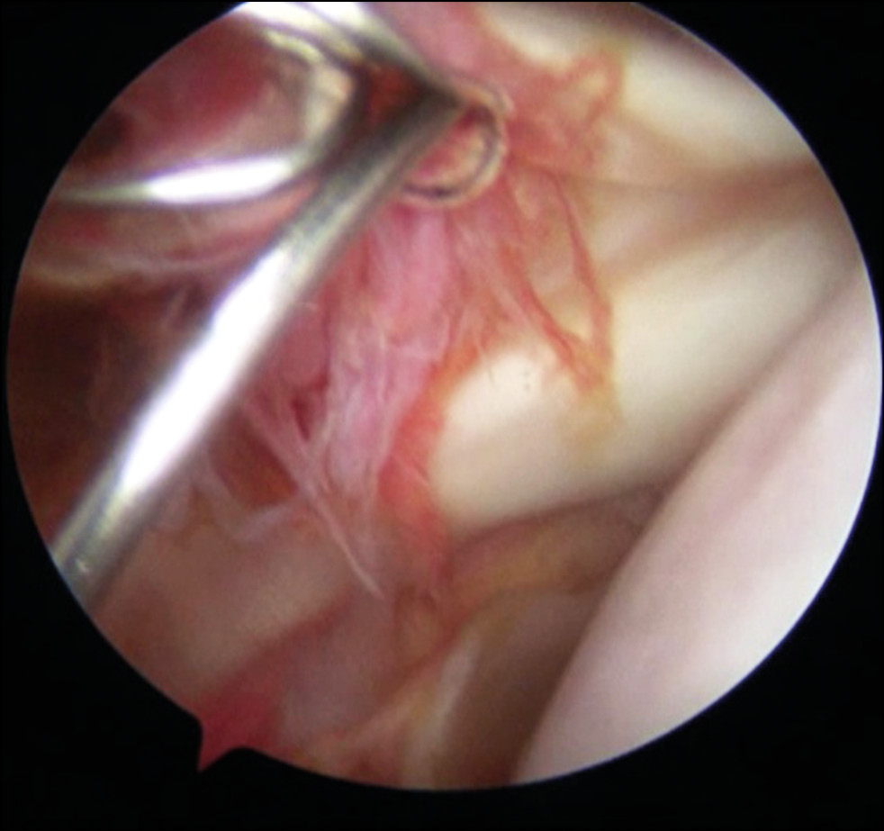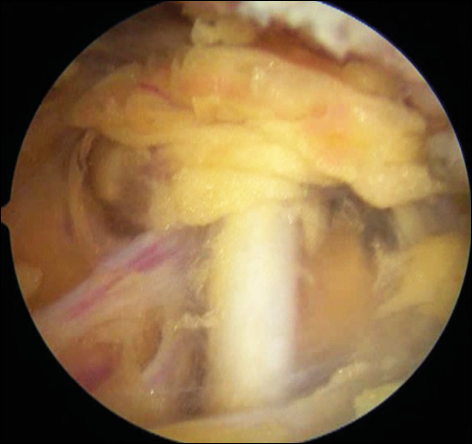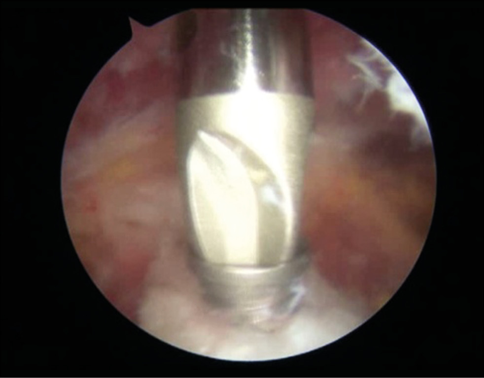 In Stage 1, the standard posterior port was installed. Moreover, the defect of the glenoid cavity and the humeral head were assessed for the presence of Hill-Sachs damage. To mobilize the joint capsule and expand the safe rotator interval, an anterior port was placed between the tendons of the long head of the biceps and the subscapular muscle using a guide needle (Fig. 4).