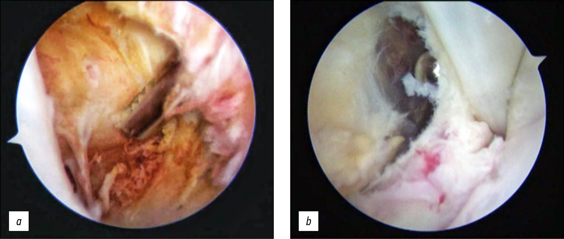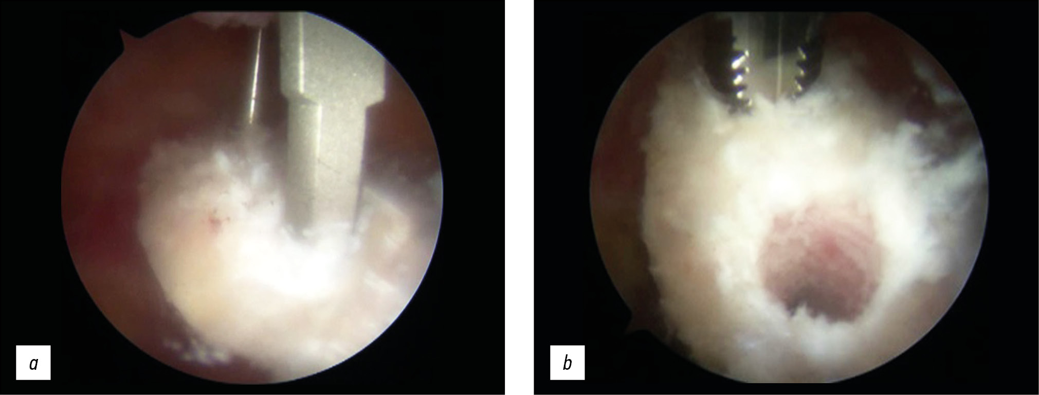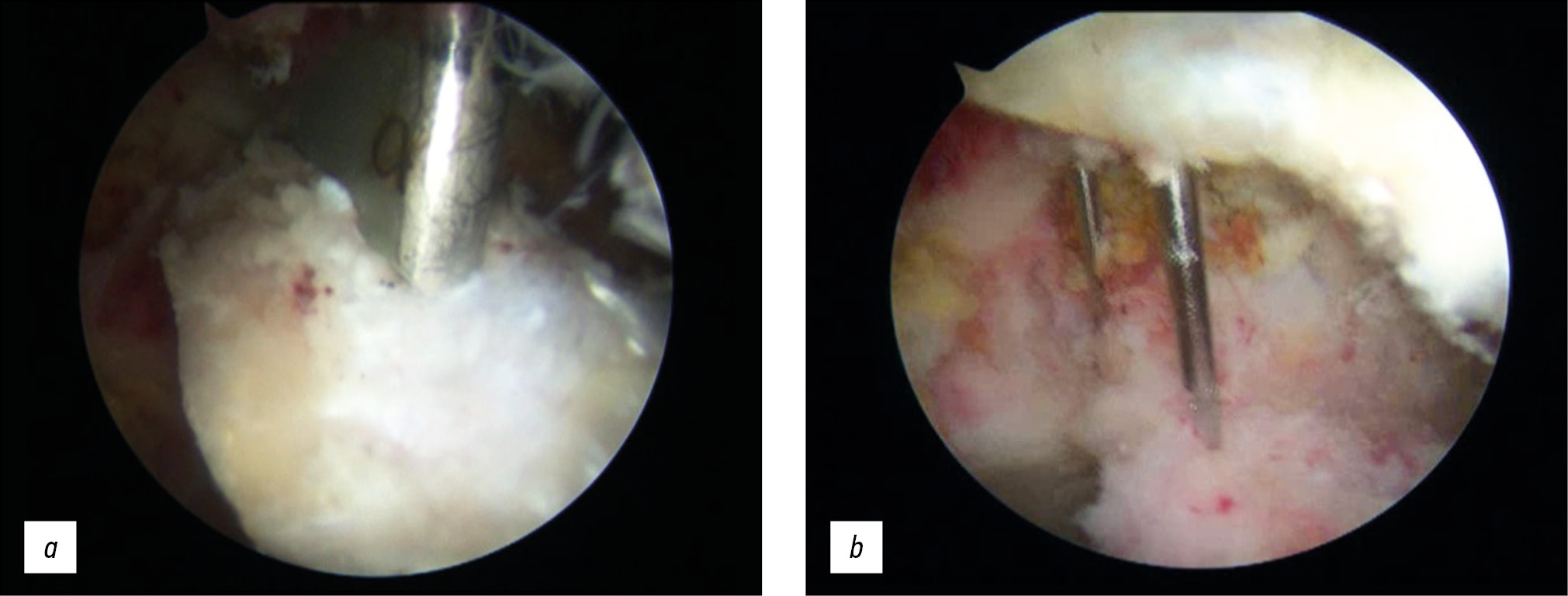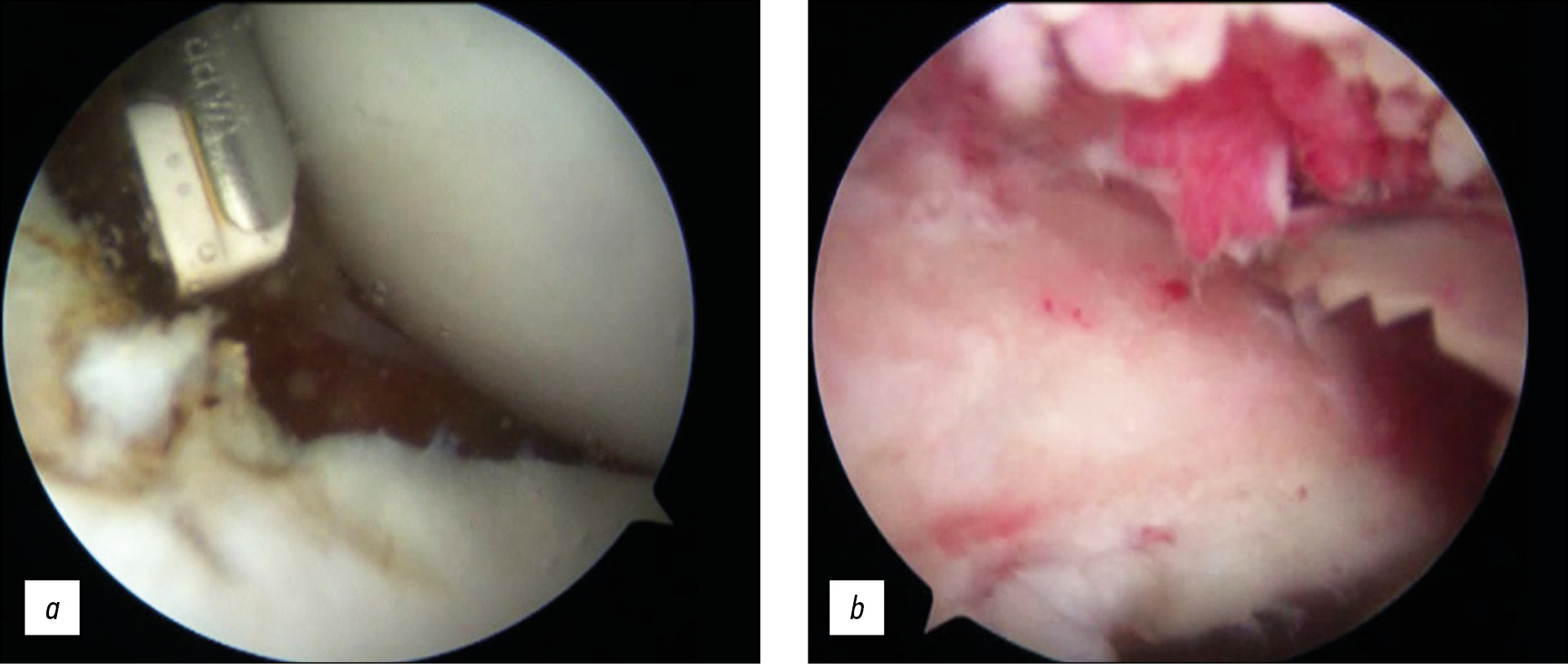 Fig. 5. Treatment of a safe rotatory interval with a shaver and coblator: a — access implementation; b — mobilization of the capsule and expansion of the rotator interval.