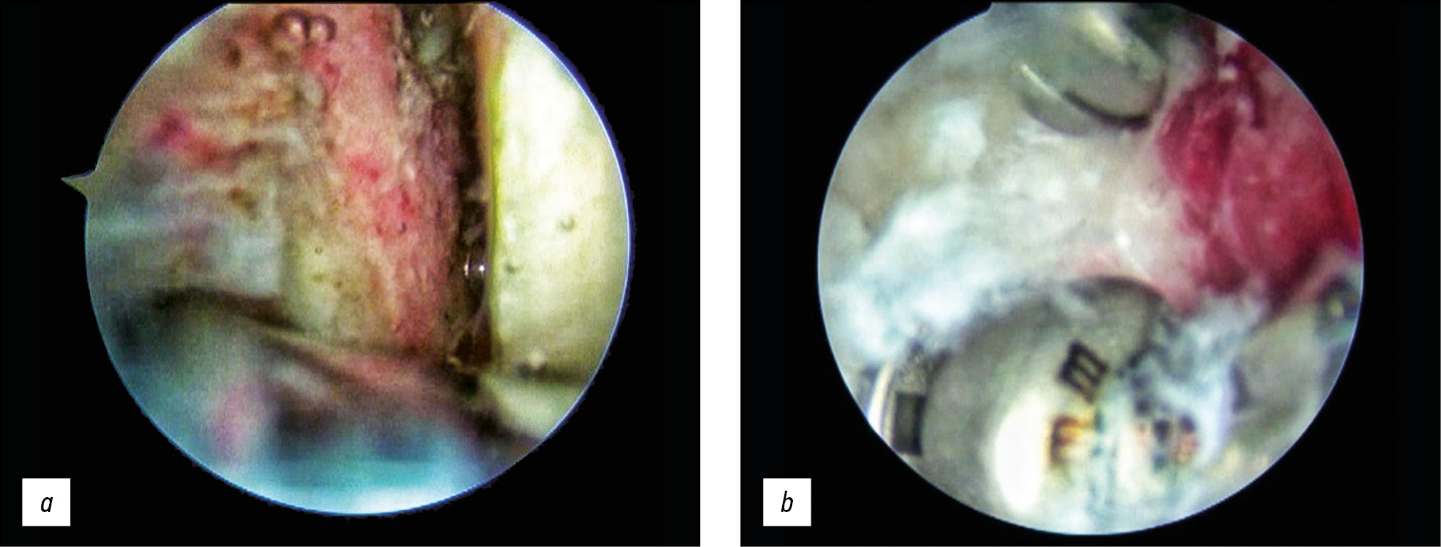 Fig. 8. Treatment of the articular surface of the scapula: a — treatment of the anterior-lower section using a coblator; b — use of a rasp in the antero-inferior glenoid region.