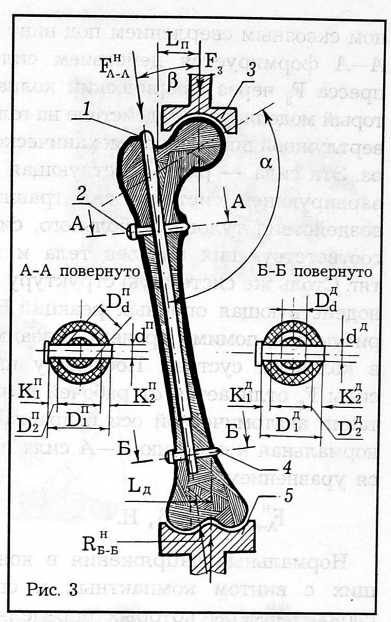 В условиях исследуемой задачи в зоне действия дистрактора (рис. 3), введенного в костномозговой канал бедренной кости через просверленное в большом вертеле отверстие, его непосредственного контакта с костью в проксимальной части бедра нет, за исключением входного отверстия 1. Опосредованно дистрактор взаимодействует с бедренной костью в ее метаэпифизарном отделе, в зоне нормально ориентированного к анатомической оси бедра плоского сечения А—А (через полносвязно соединенный с дистрактором и костью винт 2, контактирующий с компактным слоем на длинах Σ1n К и со спонгиозным на длине Dn2-Dnγ). Напряженное состояние в опасном (ослабленном сквозным сверлением под винт 2) сечении А—А формируется действием сил давления пресса F3 через сферический колпачок 3, который моделирует воздействие на головку бедра вертлужной впадины по механической оси бедра. Эта сила — равнодействующая сложной и варьирующей системы сил гравитационного воздействия туловища больного, сил инерции соответствующих звеньев тела и мышечных тяг. Столь же системную структуру имеет равнодействующая опорных реакций R, характеризующая, помимо прочего, и взаимодействия в коленном суставе. Поскольку направление силы F3 отличается от рабочей позной ориентации анатомической оси бедра на угол β, то нормальная к сечению А—А сила определяется уравнением:
