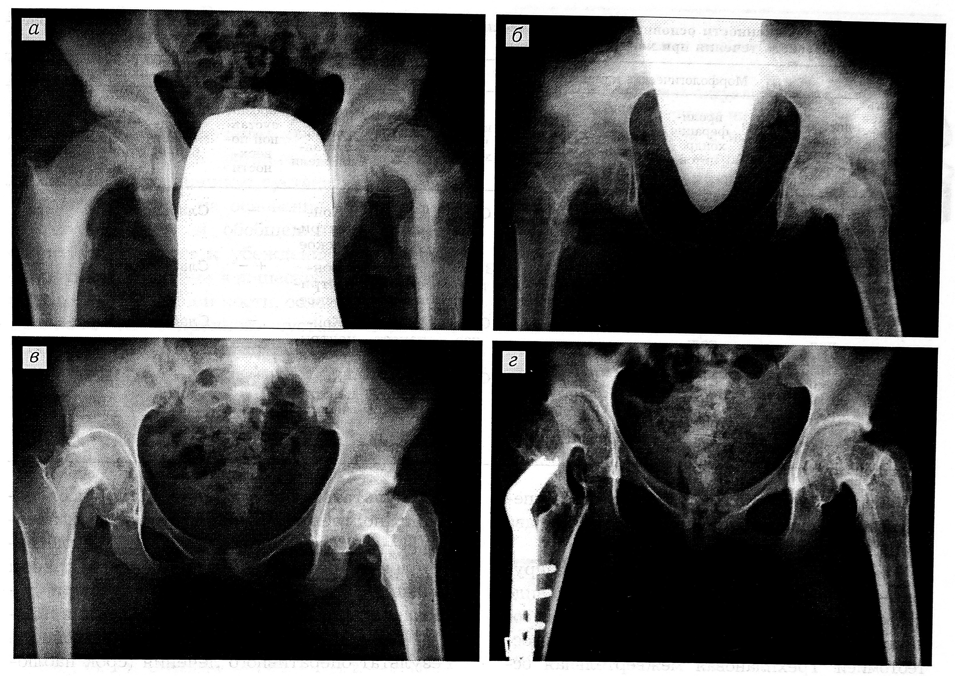 Рентгенологический диагноз [5, 9] основывается на выявлении юкстаартикулярного остеопороза, значительного сужения суставной щели, резорбции участков субхондральной кости, преждевременного закрытия зон роста вертлужной впадины, проксимальной эпифизарной и большого вертела.