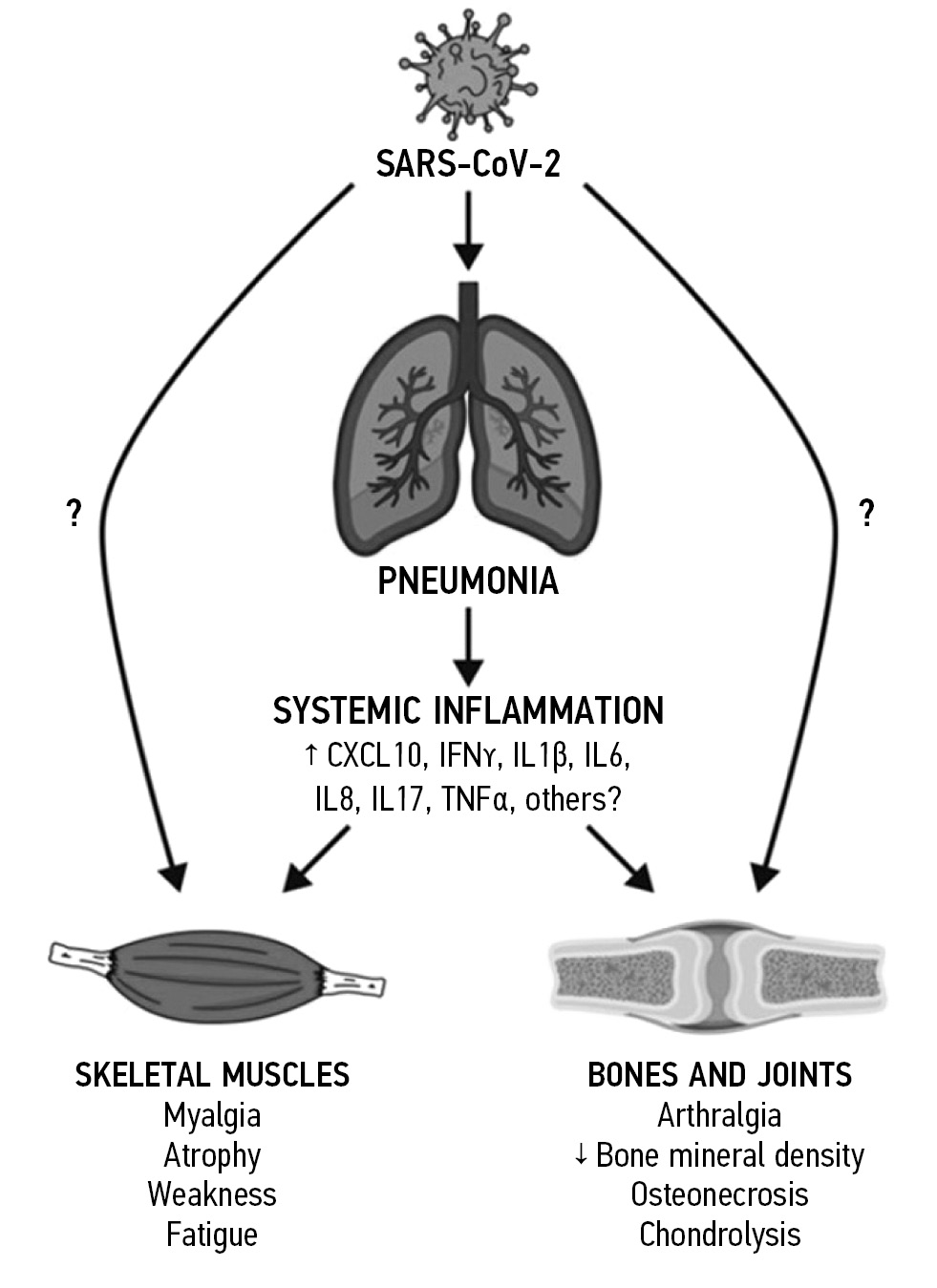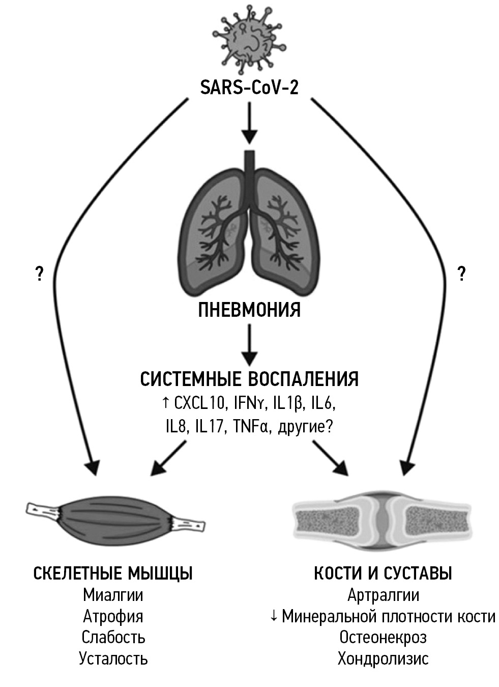 The pathogenesis of pathological changes in the musculoskeletal systems of COVID-19 patients is currently under study. Studies have shown that severe infections, including atypical pneumonia, have a significant negative impact on the entire musculoskeletal system [2]. Here is a scheme of the probable pathogenesis of lesions of the musculoskeletal system in COVID-19 patients (Fig. 1).