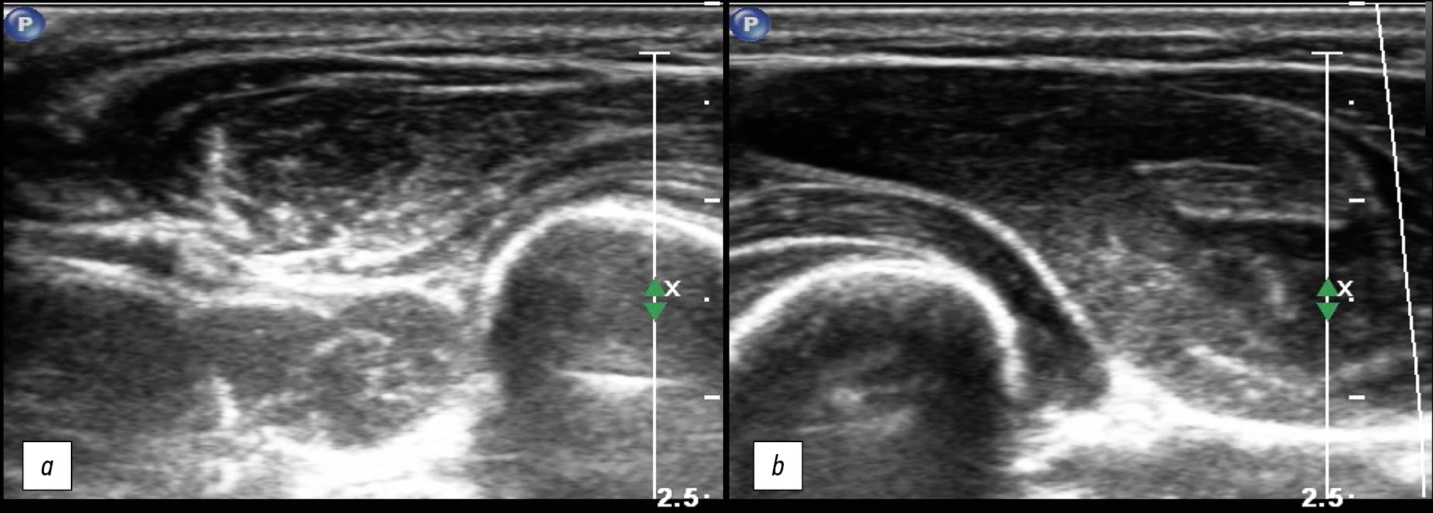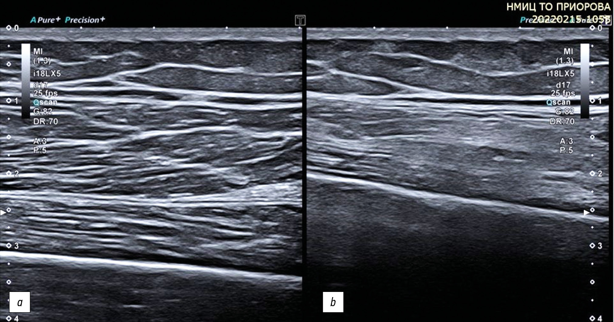Fig. 2. Cross-sectional ultrasound of muscular hypotrophy (a), comparison with the healthy side (b). The muscle volume is reduced with increased echogenicity, and differentiation into fibers is preserved.